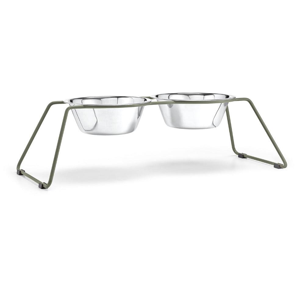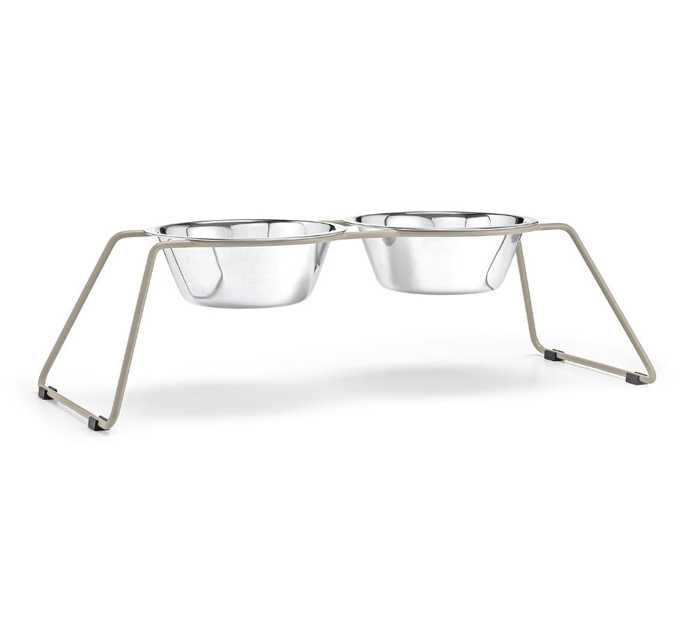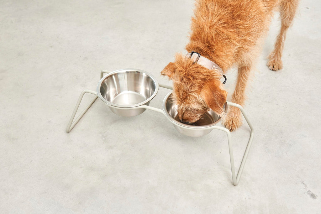 Les bols sont légèrement surélevés pour que votre chien puisse manger confortablement, et un anneau en silicone maintient chaque bol en place pour éviter les cliquetis pendant les repas. Les bols en acier inoxydable vont au lave-vaisselle et sont également disponibles séparément.