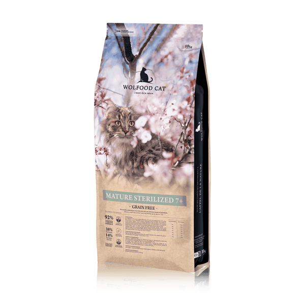 Les croquettes Wolfood Mature Sterilized 7+ sont spécialement formulées pour répondre aux besoins nutritionnels des chats stérilisés de plus de 7 ans. Cette recette sans céréales, riche en protéines animales et modérée en minéraux, accompagne le vieillissement du chat tout en soutenant la fonction rénale, la masse musculaire et le poids de forme.